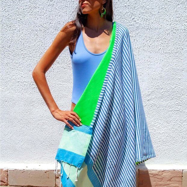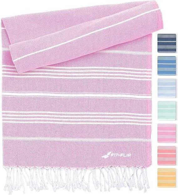 Toalha ‘hammam’ fabricada de algodão 100% reciclado. Esta ‘Futah’ da marca Fit Flip apresenta-se em diferentes cores, é leve e fácil de transportar. Absorvente e de secagem rápida. Tão versátil que até pode ser usada como pareo ou canga. Na Amazon.