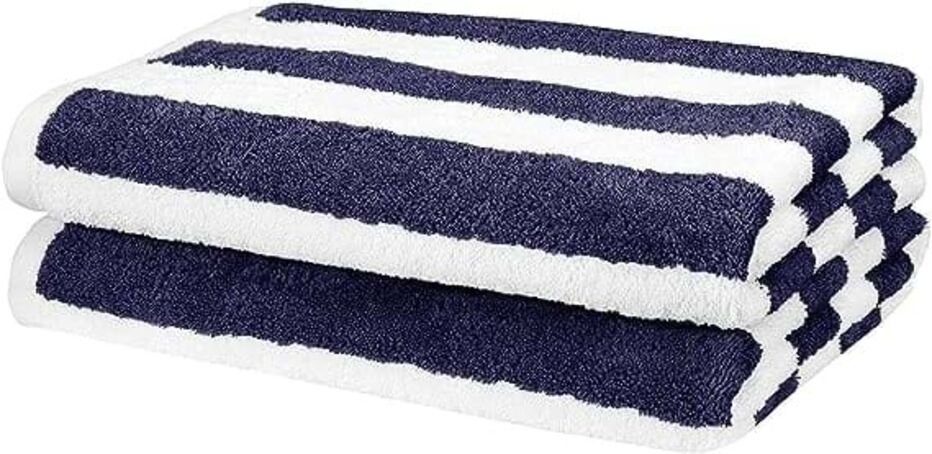 Conjunto de duas toalhas de riscas azuis e brancas em algodão/ turco. Com excelente capacidade de absorção. Costuras dobradas para maior resistência. Há em mais duas cores: azul claro e verde água. Na Amazon.