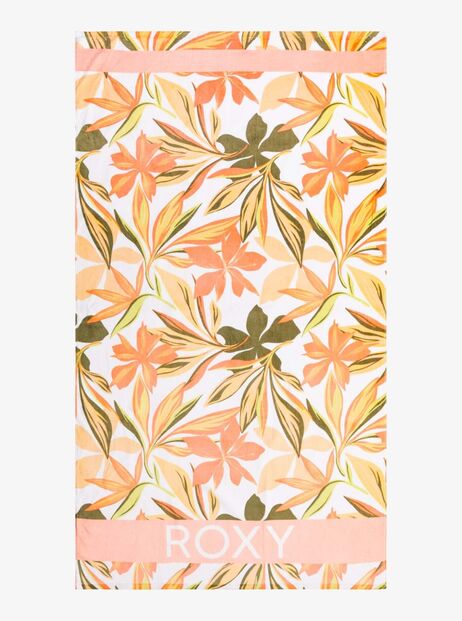Toalha ‘Cold Water Printed’ da Roxy. Turco de 100% algodão estampado em que a marca aparece em serigrafia. Em tons de amarelo, pêssego, rosa e verde seco. Há também em tons de azul turquesa.