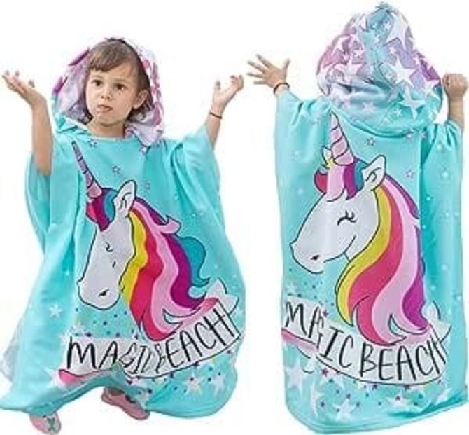 Poncho infantil com capuz e com desenho de unicórnio. Para secar os mais pequenos. Na Amazon.