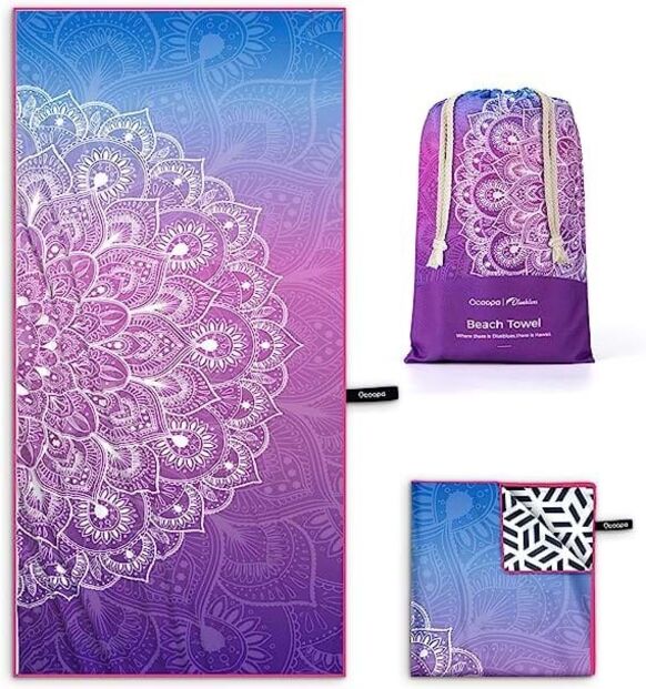 Toalha mágica anti-areia reversível. De tamanho XL [178x80CM], esta toalha de microfibra é leve, ultra absorvente e de secagem rápida. Existe em diferentes cores e padrões. Na Amazon.