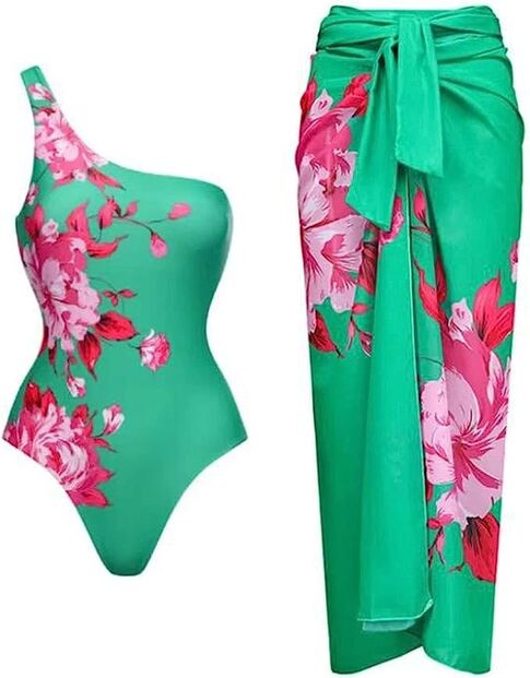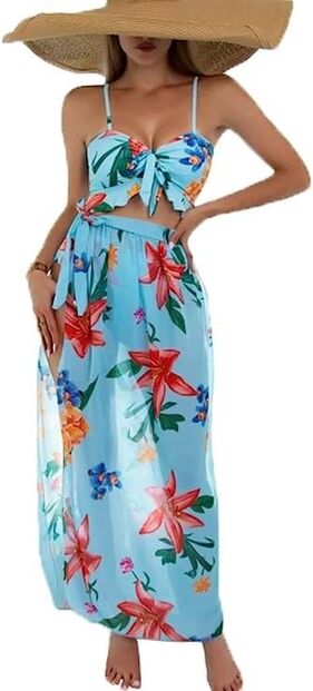 1. Conjunto de três peças, inclui top de biquíni, cueca e pareo/saia transparente do mesmo padrão. O pareo de abertura lateral é perfeita para ir à esplanada ou para cobrir as pernas nas horas de maior calor e risco de queimadura. Da marca Chuangminghanggi em quatro cores e padrões diferentes.