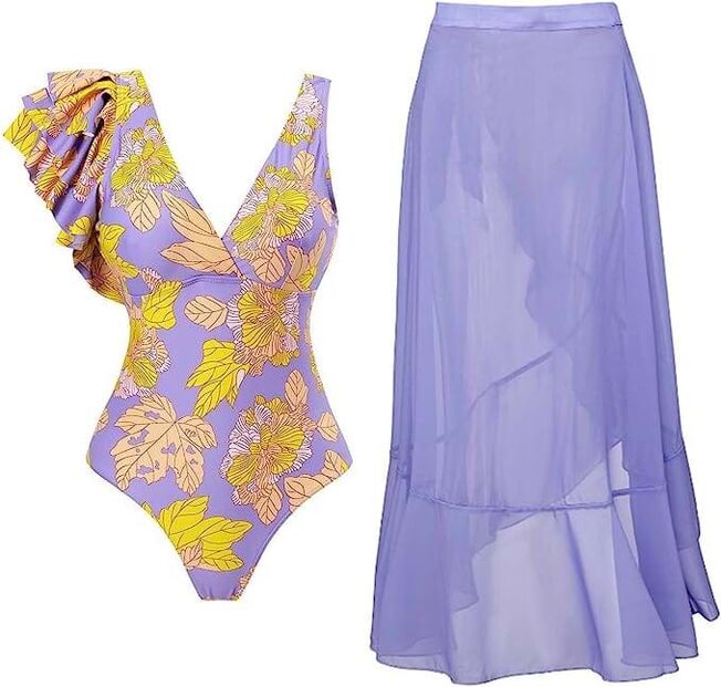 4. Conjunto de duas peças em tons de lilás e amarelo. Fato-de-banho com uma das alças com folhos múltiplos e pareo transparente a combinar. Da marca Laonajkd com 40 modelos à escolha.