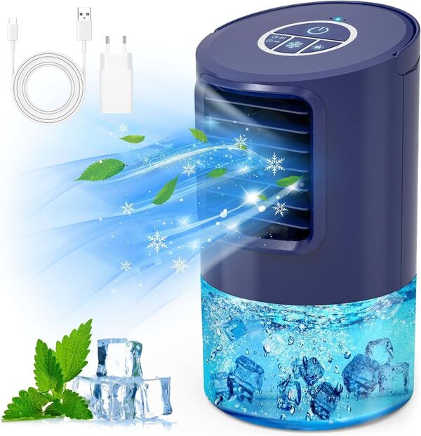 Com baixo nível de ruído e carregamento através de ficha USB, este mini ar condicionado pode andar consigo para todo o lado e nos dias mais quentes, quando a ventoinha já não é suficiente, vai transformar-se num fantástico refrigerador, sendo que, para isso, basta adicionar água gelada, ou água com cubos de gelo ao tanque apropriado para o efeito.