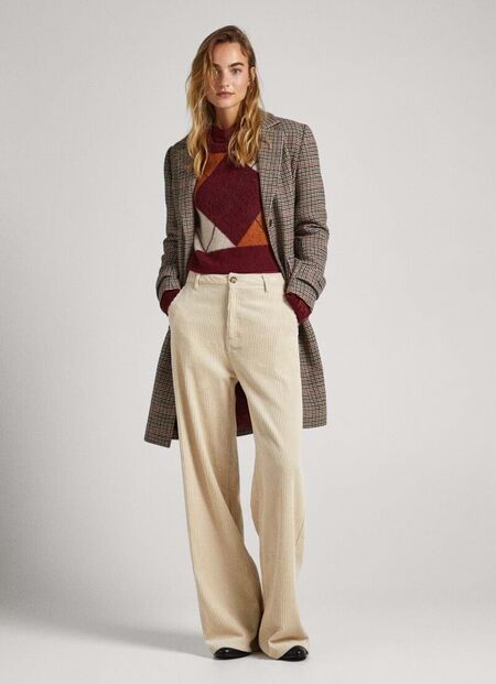 As calças de bombazine são outro clássico que faz parte dos armários das mulheres mais elegantes. Ficam bem em cores neutras, como o cru ou o bege, mas também em tons como o azul escuro. São quentinhas e adaptam-se tanto a looks mais formais como aos mais descontraídos.