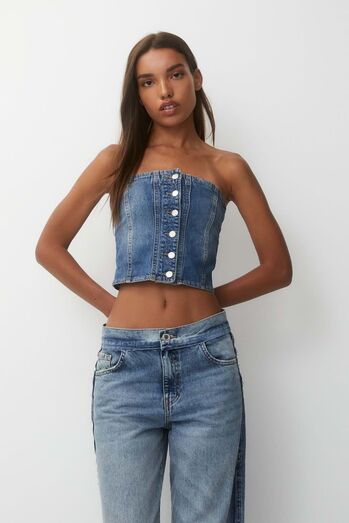 Ganga vai ser um dos materiais mais usados na próxima estação. E vai estar por todo o lado, seja em jeans, saias, casacos, ou tops como este à venda na Pull and Bear.
