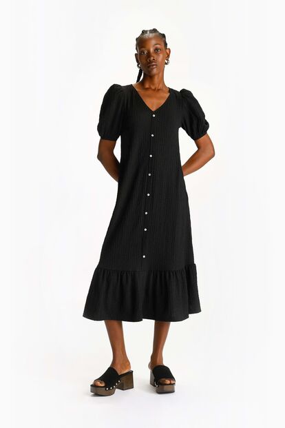 Em todas as estações precisamos de um vestido preto no nosso guarda-roupa. É uma cor que associamos à elegância, mas também a um certo estilizar da silhueta, sendo o tom que podemos escolher nos dias em que não nos sentimos tão inspiradas. Mas a verdade é que um vestido preto não precisa de ter pouca graça, pelo contrário. Este modelo da Lefties é a prova de que podemos juntar o melhor de dois mundos, e ter um vestido preto que é um must have.