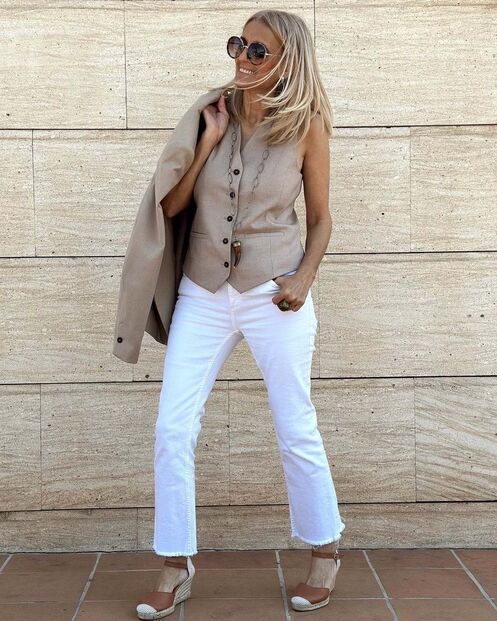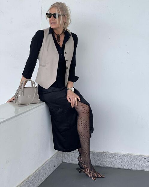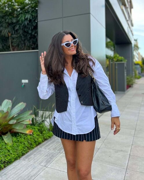 Se escolher um colete clássico de alfaiataria, opte por tons neutros para o poder combinar com quase tudo. Bege, branco ou preto são apostas seguras, mas o colete azul marinho com risca de giz será uma decisão muito elegante. Aqui, este colete é da marca Vagbalena e o preço é de 27,44€ (pode conseguir comprar por um preço inferior).