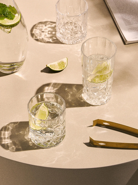 O que também ajuda a criar a sensação de elegância são uns copos bonitos, com relevo, ou algum detalhe que faça a diferença. A mesa fica logo mais composta.
