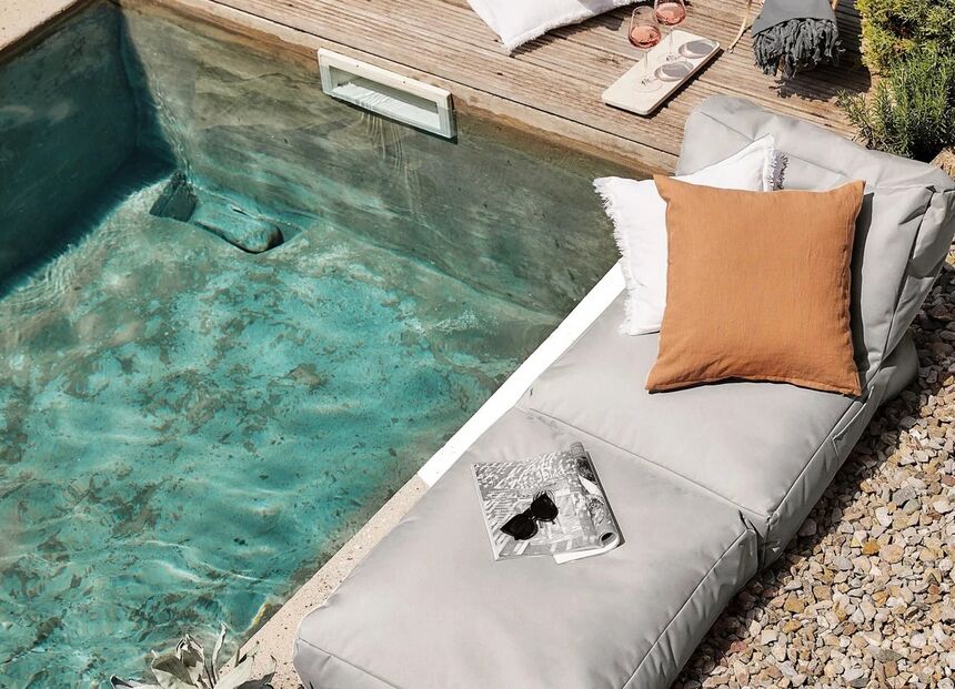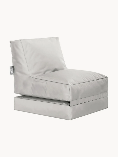 Funciona como uma peça desdobrável e tanto pode servir de sofá como, na sua versão inteira, de uma cama confortável para apanhar sol ou descontrair.