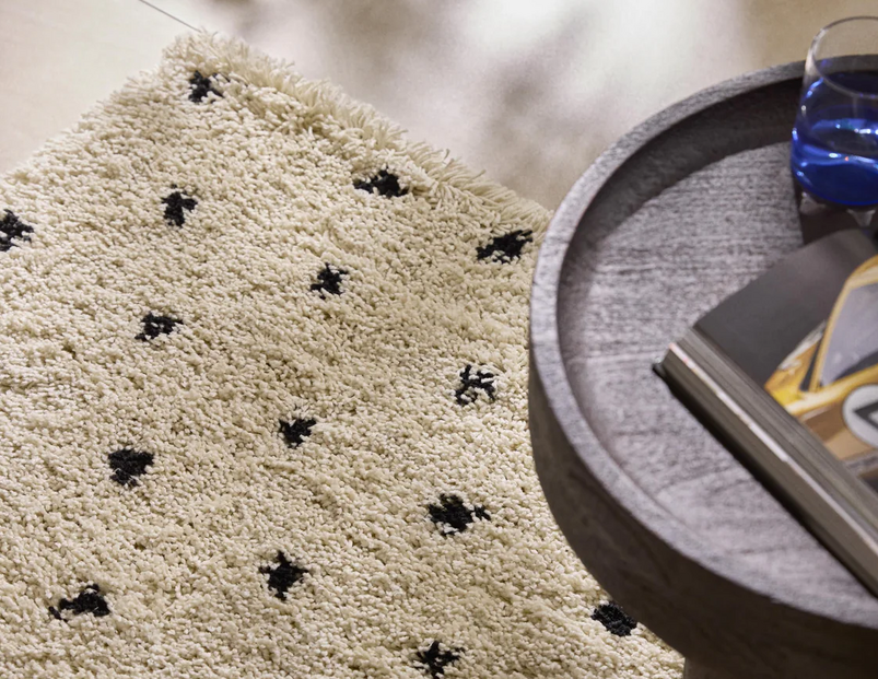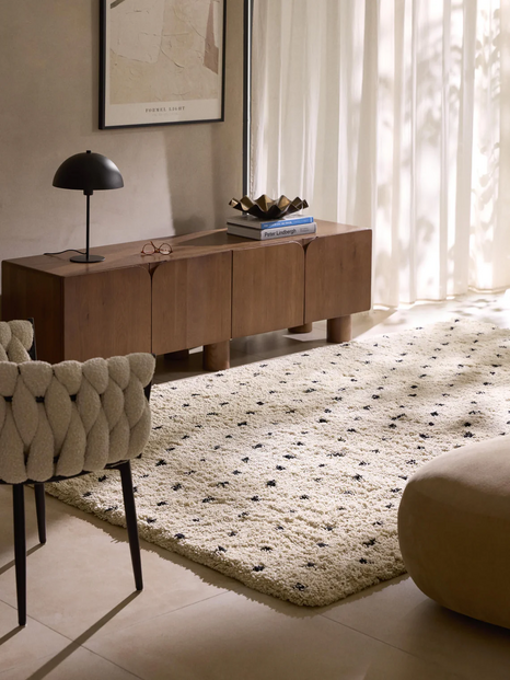 Trata-se de um tapete felpudo com ténues pintas em preto, que é querido e elegante na mesma medida, conseguindo mudar o mood da decoração de uma sala.