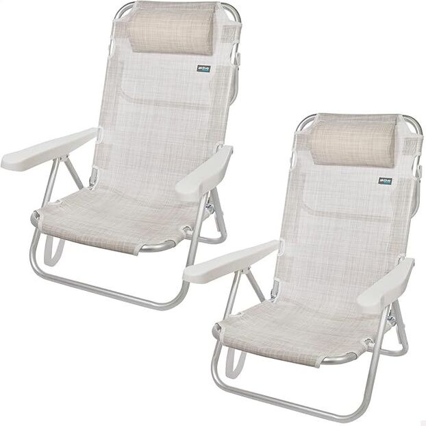 O pack de cadeiras que vai querer levar para todo o lado. Este pack poupança de 2 cadeiras de praia modelo Ibiza, da Aktive Beach, é a escolha ideal para quem procura conforto, praticidade e resistência. Com estrutura em alumínio leve e resistente e tecido impermeavél e fácil de limpar, cada cadeira suporta até 100 kg, perfeito para dias com sol, sal e areia. As 5 posições de inclinação, ajustáveis, permitem relaxar como quiser, mais sentado para ler ou totalmente reclinado, estilo espreguiçadeira. Cada cadeira tem uma almofada acolchoada e alças de transporte, para que possa levá-las consigo sem esforço. Com apenas 21 cm de altura no assento e design compacto quando fechadas, são ideais para levar no carro sem ocupar muito espaço.