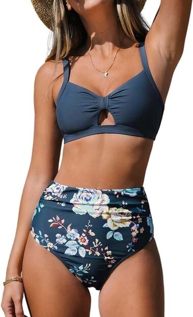 Os biquínis de padrão floral são a forma mais romântica de mergulhar nesta tendência de cueca subida. Este, em azul marinho, é elegante e sofisticado para o verão.
