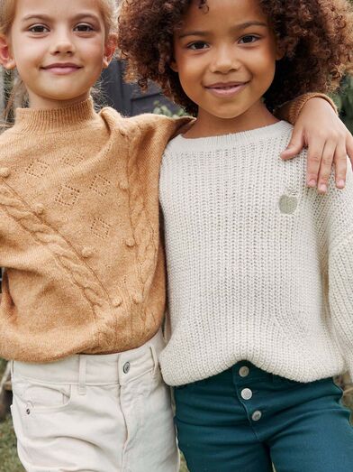 As camisolas de malha são outra daquelas peças obrigatórias e que precisamos de ter várias no guarda-roupa. Vão ser as maiores aliadas dos seus filhos durante os meses frios e deixá-los confortáveis e bem vestidos para qualquer ocasião. Adoramos esta, com torcidos, bronze, que fica perfeita combinada, por exemplo, com calças de bombazina ou jeans brancos.