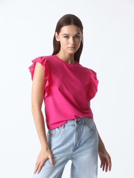 E o verdadeiro look Barbie envolve normalmente pormenores românticos como os folhos. Esta t-shirt da Lefties em rosa chamou a nossa atenção. O detalhe dos folhos na manga ajuda a completar um visual pefeito.